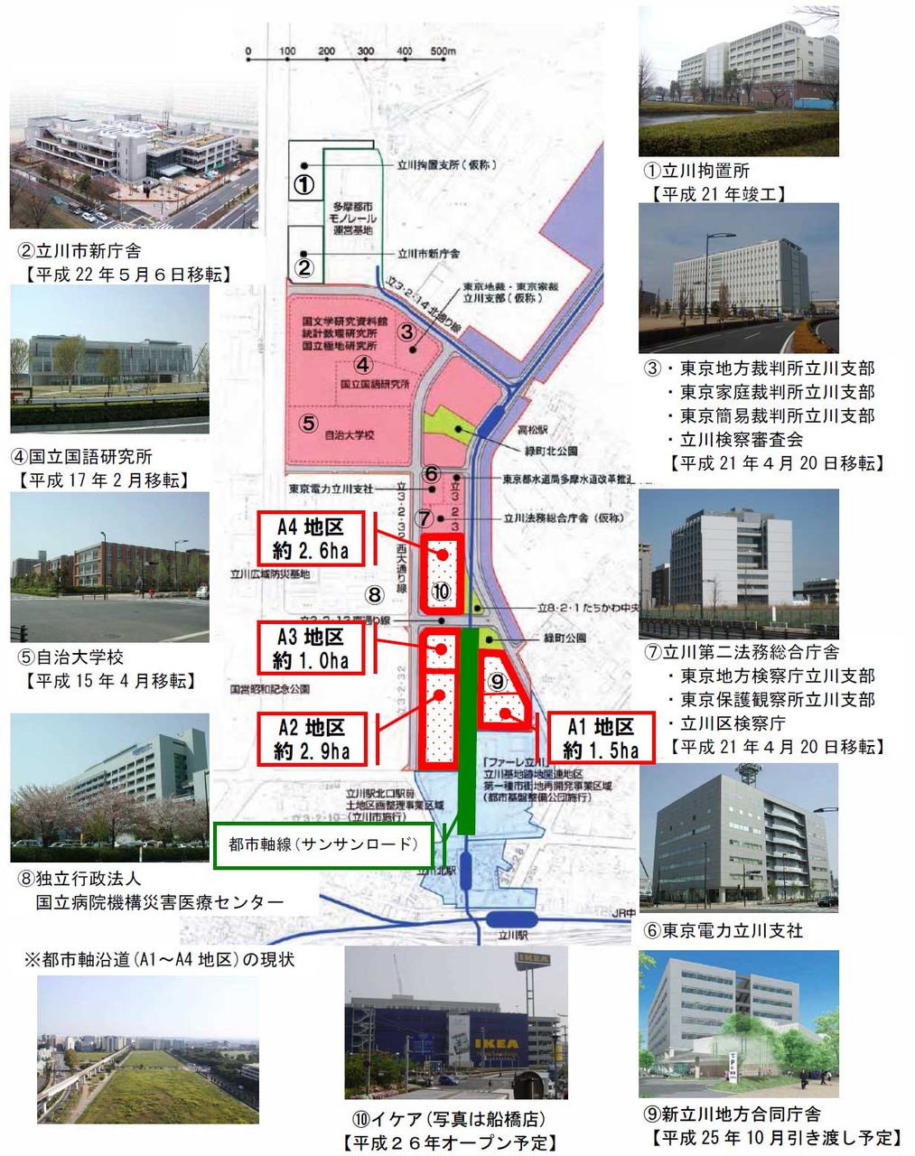 A4地区は立川駅から徒歩13分。伊勢丹、高島屋、パレスホテル、ビジネスセンターの「ファーレ立川」と北口の主要施設をつなぐ動線の先にあり、立川の主要幹線のひとつ、南北道路や多摩地域最大級の都市公園、昭和記念公園が近くにある。鉄道、マイカー双方の客を呼び込める立地。
